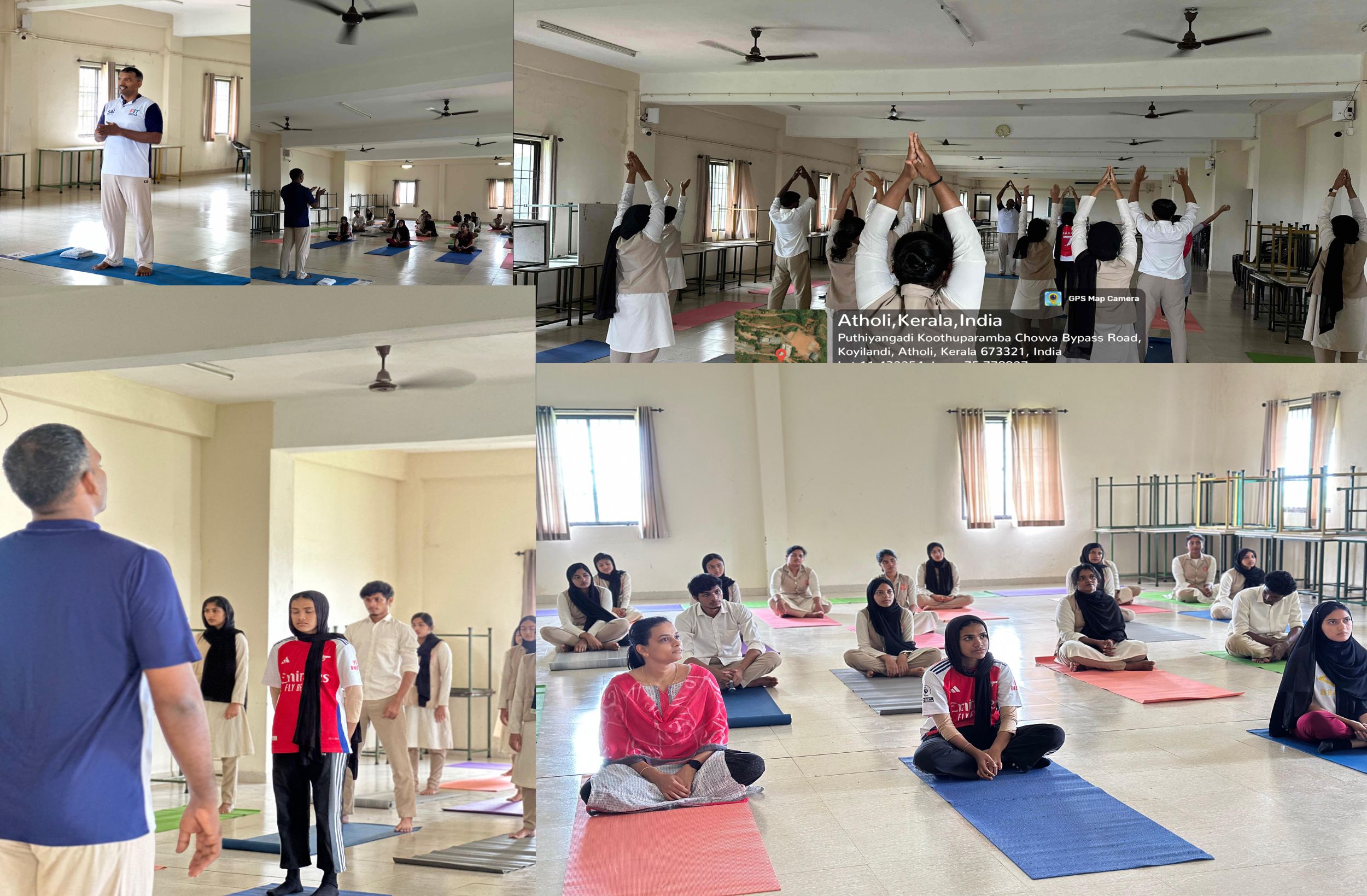 The theme for the 11th International Day of Yoga in 2025 is " YOGA FOR ONE EARTH, ONE HEALTH", reflecting the vital truth that personal wellness and planetary health are inseparably linked. On this occasion, Mr. Vipin C, Assistant Professor, conducted a session on basic yoga postures & the fundamentals of meditation from 10:00 am to 12:00 pm for the students of BSc. Optometry, BSc. MLT & BPT on 21st June 2025 at the Multipurpose Hall, Sree Anjaneya College of Paramedical Sciences, Modakkallur.