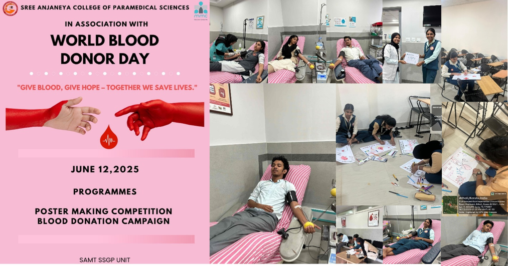 On the occasion of World Blood Donor Day 2025, Sree Anjaneya College of Paramedical Sciences in collaboration with Malabar Medical College conducted a series of meaningful events on June 12, 2025, under the global theme "Give Blood, Give Hope- Together We Save Lives". The programme aimed to promote awareness about the importance of voluntary blood donation and to celebrate the silent heroes- our blood donors. Student union & the SSGP unit played a vital role in organizing & coordinating the event.