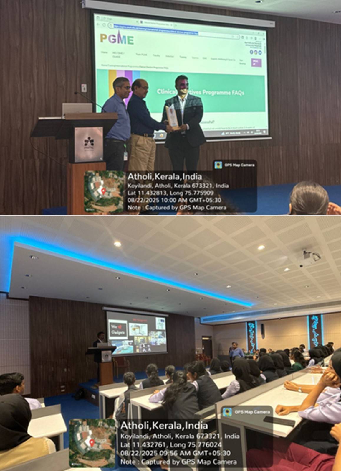 A special interactive session was organized at Malabar Medical College Hospital & Research Centre (MMC&HRC), Ulliyeri, Kozhikode on 22nd August 2025 at 9:30 AM in Sapphire Hall. The guest speaker was Dr. Girish N. Swami, Consultant and Lead Spine Surgeon, Norfolk and Norwich University Hospital, NHS, United Kingdom. He addressed the students of MMC&HRC regarding career opportunities abroad, particularly in the UK.
