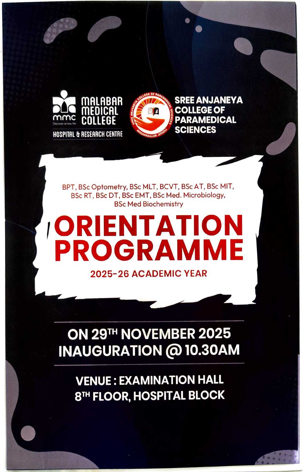 The Orientation Programme for the 2025–26 Academic Year is organized by Sree Anjaneya College of Paramedical Sciences, under Malabar Medical College Hospital & Research Centre. This event welcomes newly admitted students across various paramedical and allied health science courses, including: